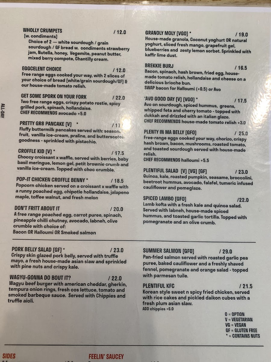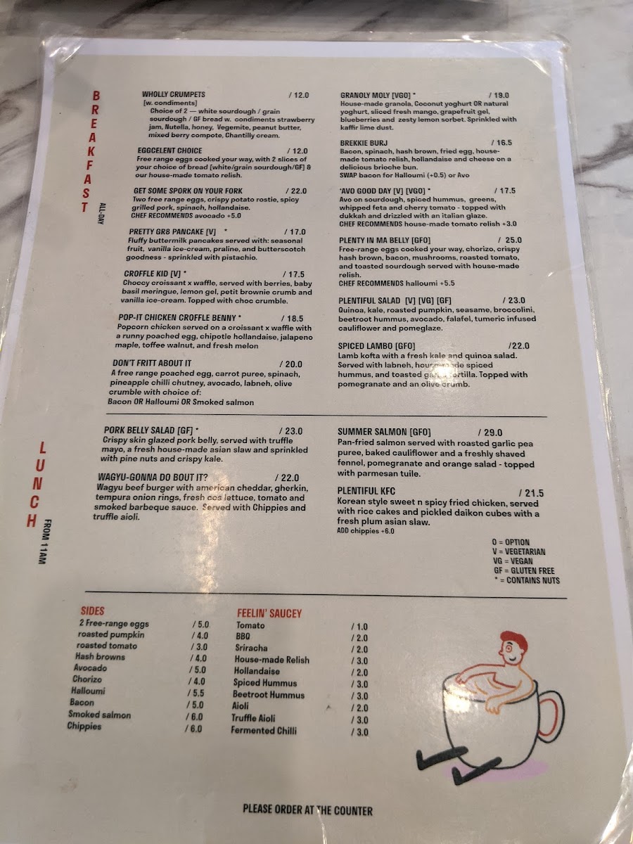 During the day, the menu expands into heartier offerings designed to satisfy a range of tastes—from the delicate lychee pannacotta and matcha pancakes to more substantial bites like the Pop-It Chicken Croffle Benny or spiced lambos. Sides like streaky bacon, halloumi, and sautéed kale allow you to customize your meal, while fresh cold-pressed juices add a refreshing touch.